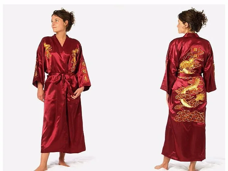 Burgundy Chinese Women's Traditional Silk Satin Robe Embroidery Dragon Kimono Yukata Bath Gown Oversize S M L XL XXL XXXL A135