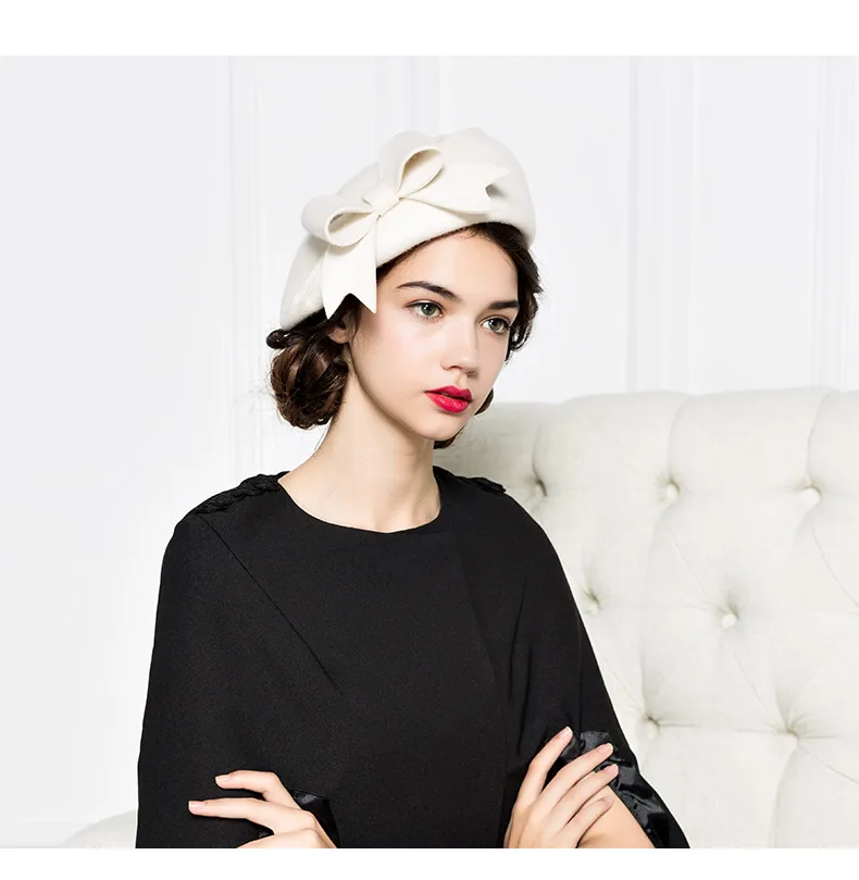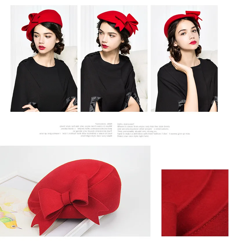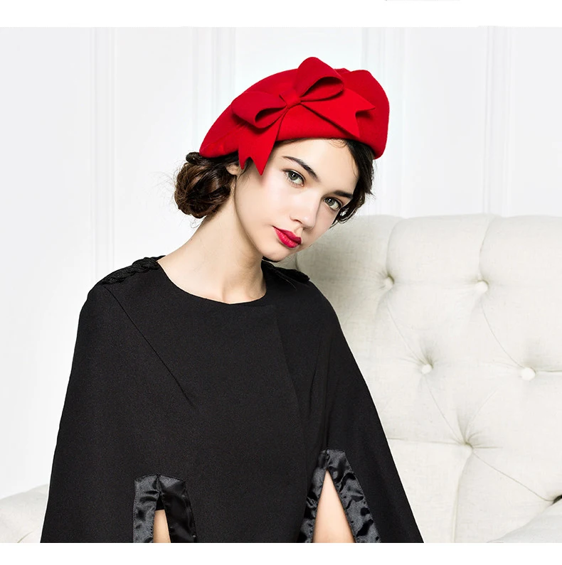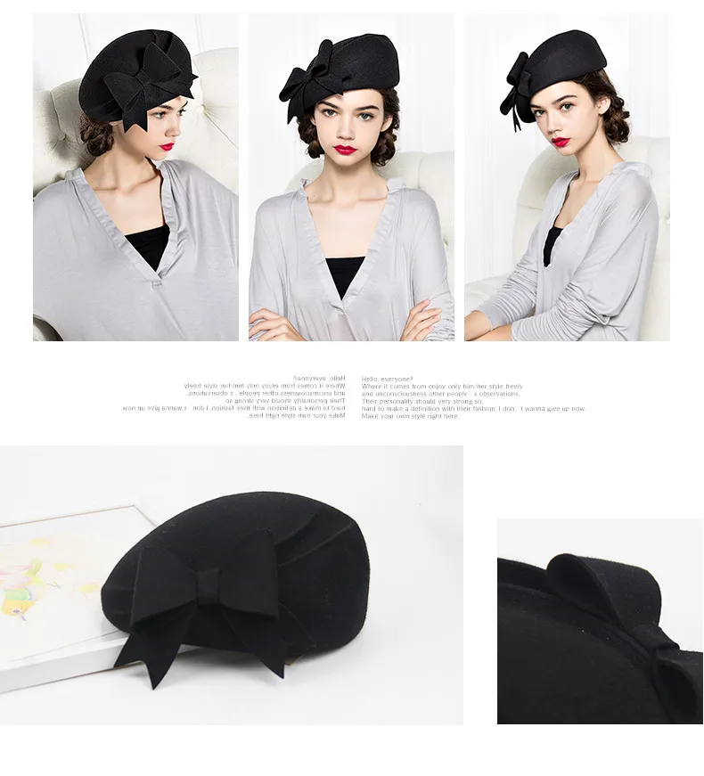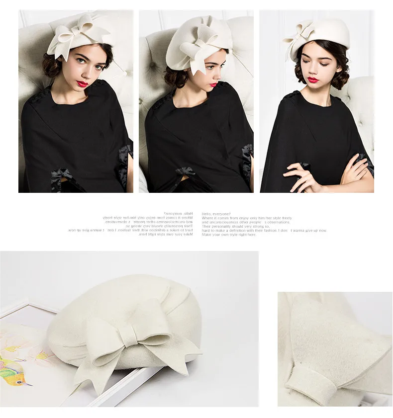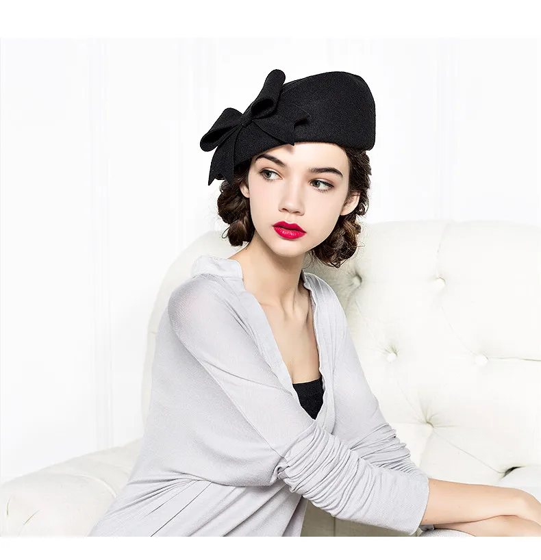 FS Elegant Beret Women's Wool Felt Fascinators Fedora Red Church Hats White Black Wedding Ladies Hat Bow Caps Pillbox Hat Korean