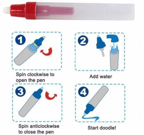 • SAFE & DURABLE--- It is environmental clean and safe for children. The back of the mat is WATER-RESISTANT nylon material, no worry about wetting the floor. The water pen is fairly indestructible and does not make a mess. NOTE: Soak the tips in water for 30 minutes prior to use for better results. The opening direction of the pen is backwards,you need to loosen the head of pen in POSITIVE direction.