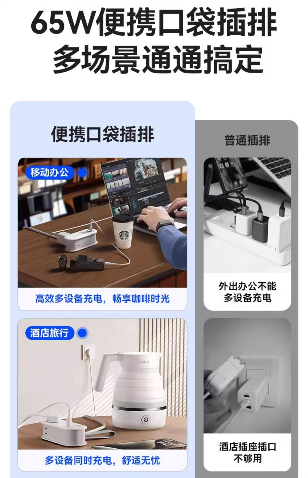 2×USB-C(65W) + 2×USB-A(18W) + 3×AC outlets