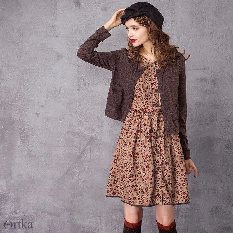 ARTKA Women's Autumn New Floral Printed Twin-set Dress Fashion O-Neck Long Sleeve Empire Waist A-Line Dress LA10437Q