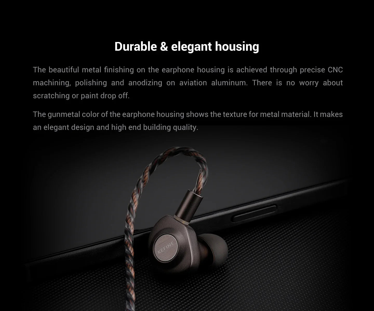 The beautiful metal finishing on the earphone housing is achieved through precise CNC machining, polishing and anodizing on aviation aluminum. There is no worry about scratching or paint drop off.