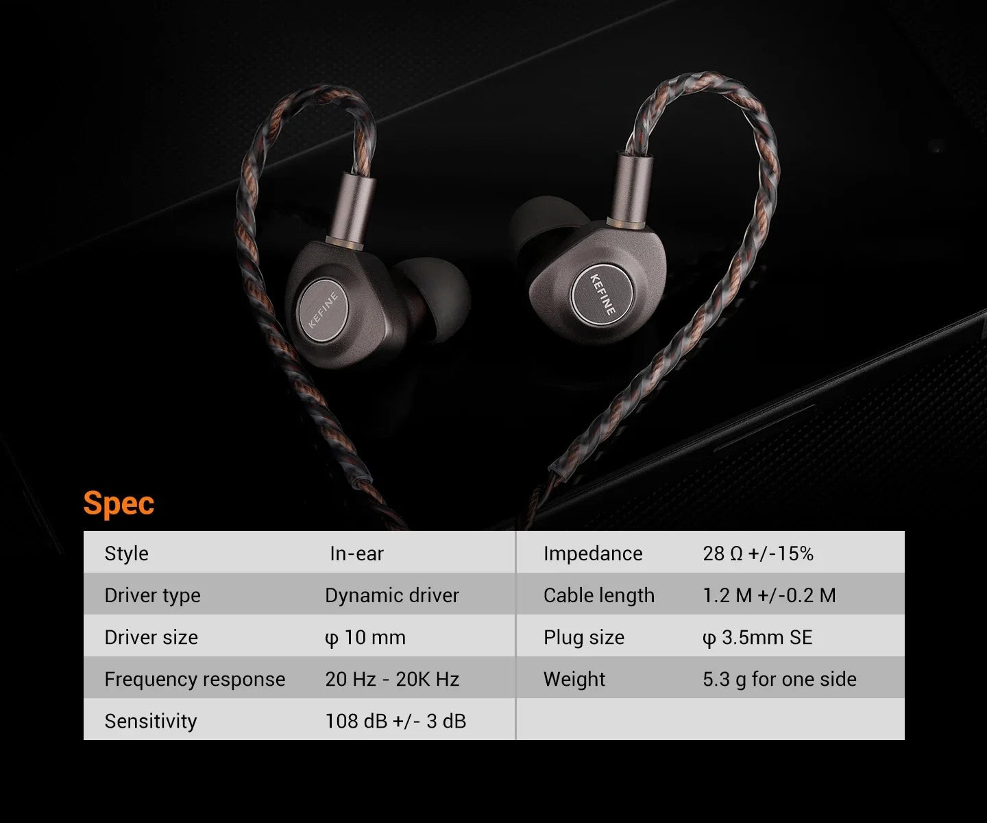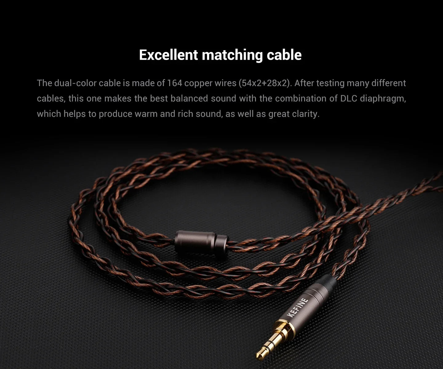 The dual-color cable is made of 164 copper wires (54x2+28x2). After testing many different cables, this one makes the best balanced sound with the combination of DLC diaphragm which helps to produce warm and rich sound, as well as great clarity.