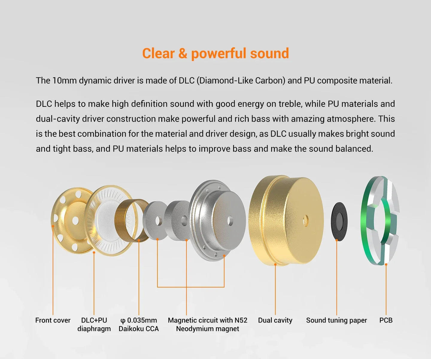 DLC helps to make high definition sound with good energy on treble, while PU materials and dual-cavity driver construction make powerful and rich bass with amazing atmosphere. This is the best combination for the material and driver design, as DLC usually makes bright sound and tight bass, and PU materials helps to improve bass and make the sound balanced.