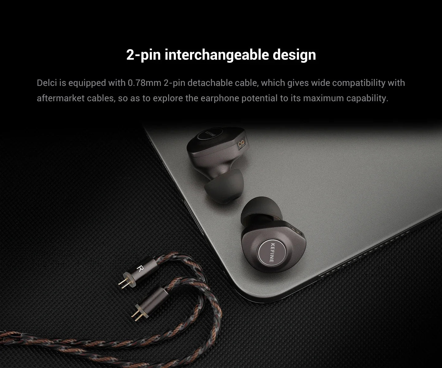 Delci is equipped with 0.78mm 2-pin detachable cable, which gives wide compatibility with aftermarket cables, so as to explore the earphone potential to its maximum capability.