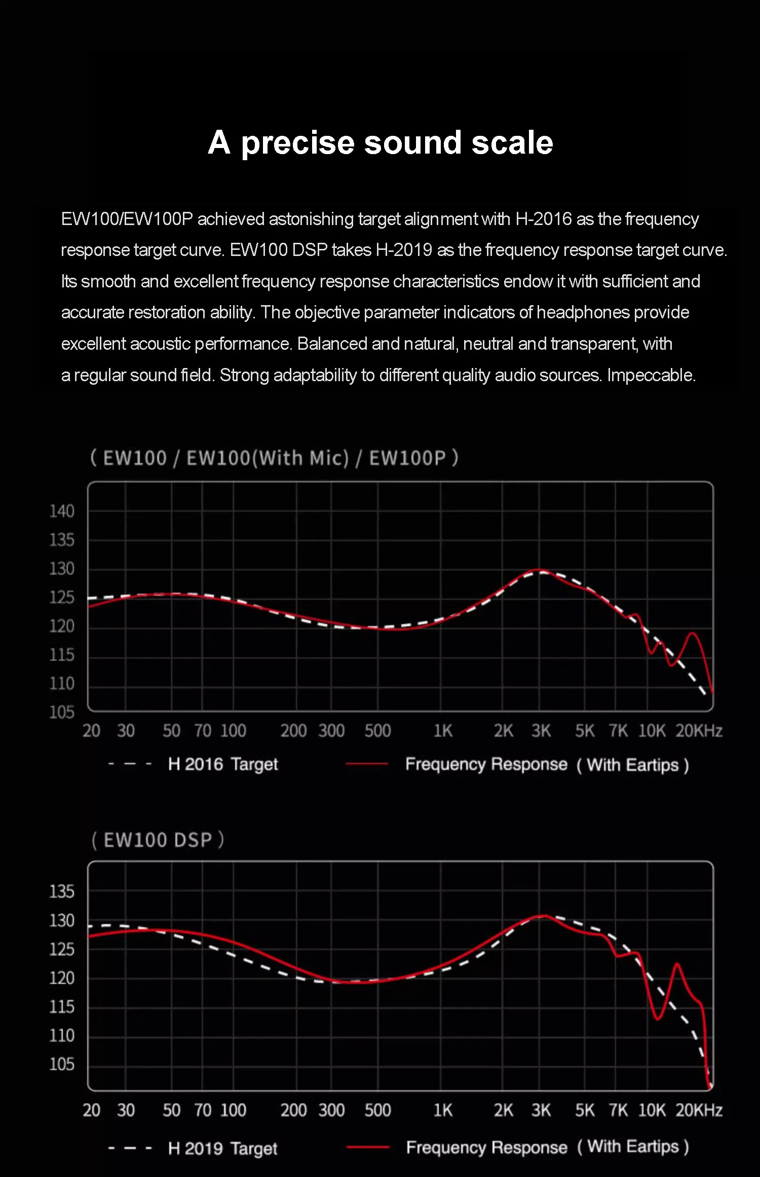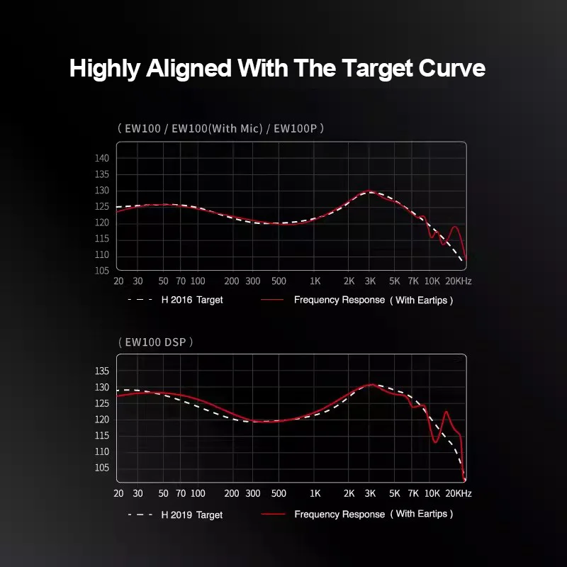 EW100/EW100P achieved astonishing target alignment with H-2016 as the frequency response target curve. EW100 DSP takes H-2019 as the frequency response target curve.