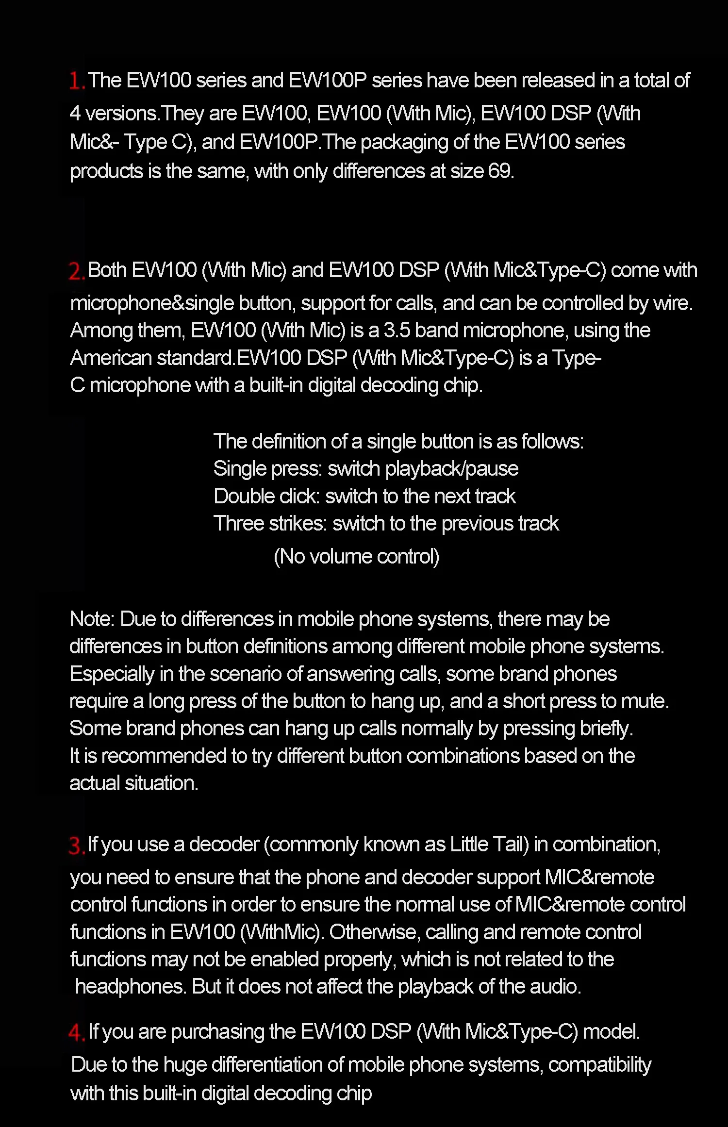 If you use a decoder (commonly known as Little Tail) in combination, you need to ensure that the phone and decoder support MIC&remote control functions in order to ensure the normal use of MIC&remote control functions in EW100 (WithMic). Otherwise, calling and remote control functions may not be enabled properly, which is not related to the headphones. But it does not affect the playback of the audio.