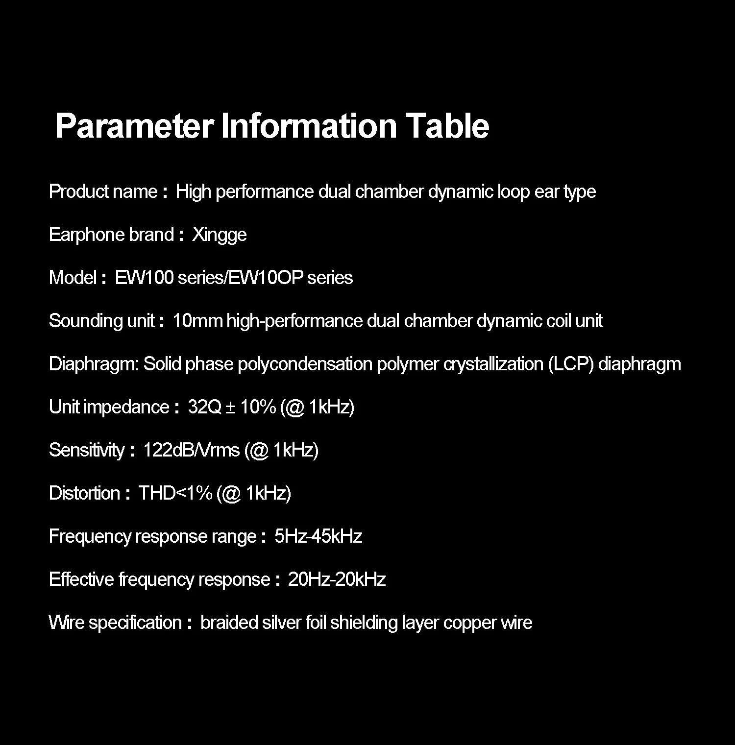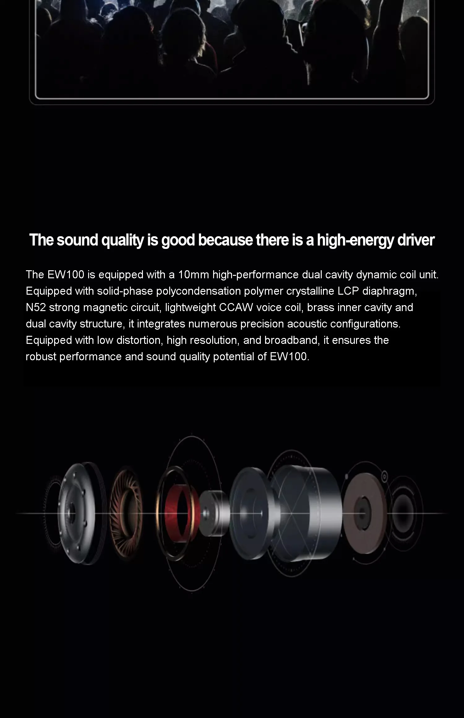 The EW100 is equipped with a 10mm high-performance dual cavity dynamic coil unit. Equipped with solid-phase polycondensation polymer crystalline LCP diaphragm,N52 strong magnetic circuit, lightweight CCAW voice coil, brass inner cavity and dual cavity structure, it integrates numerous precision acoustic configurations. Equipped with low distortion, high resolution, and broadband, it ensures the robust performance and sound quality potential of EW100.