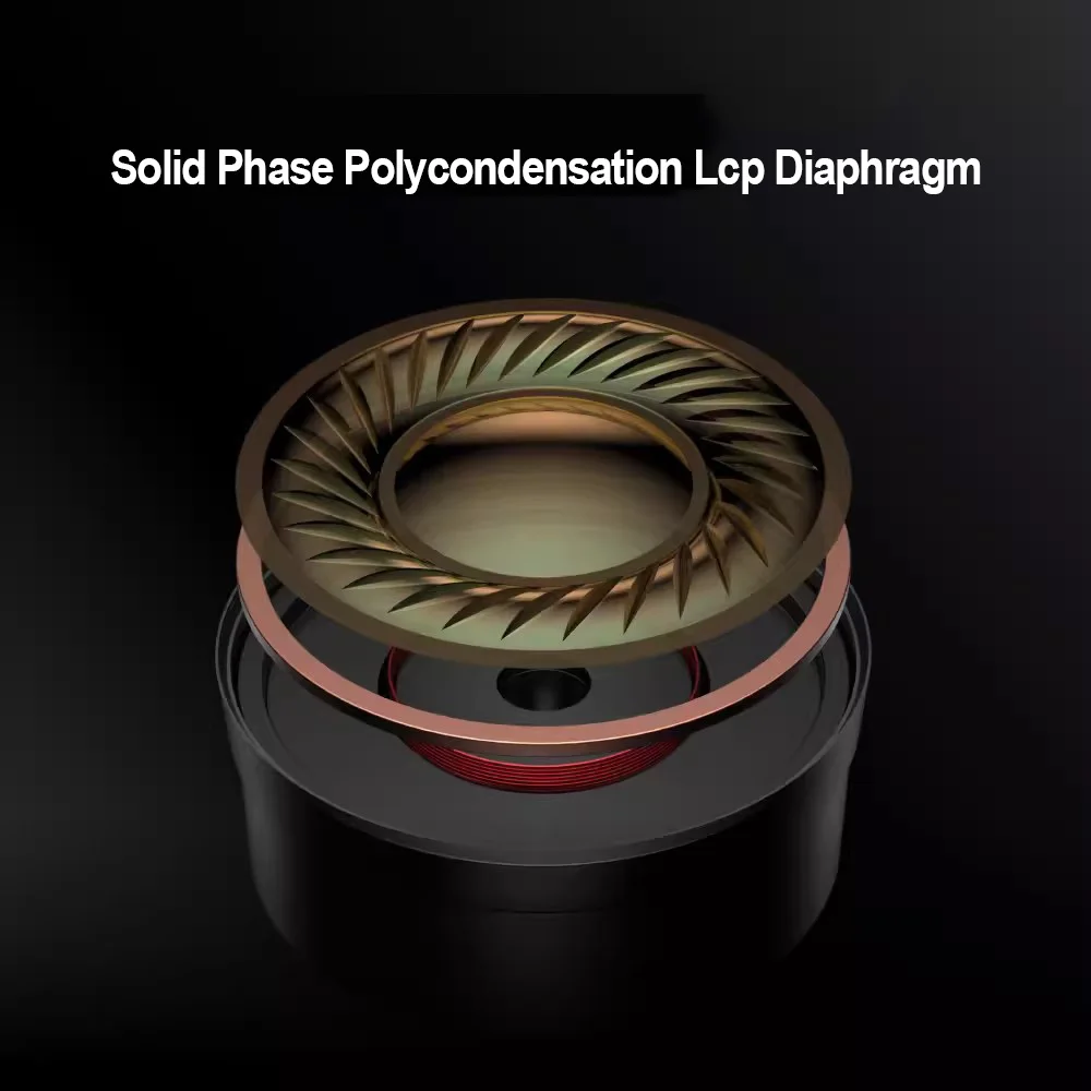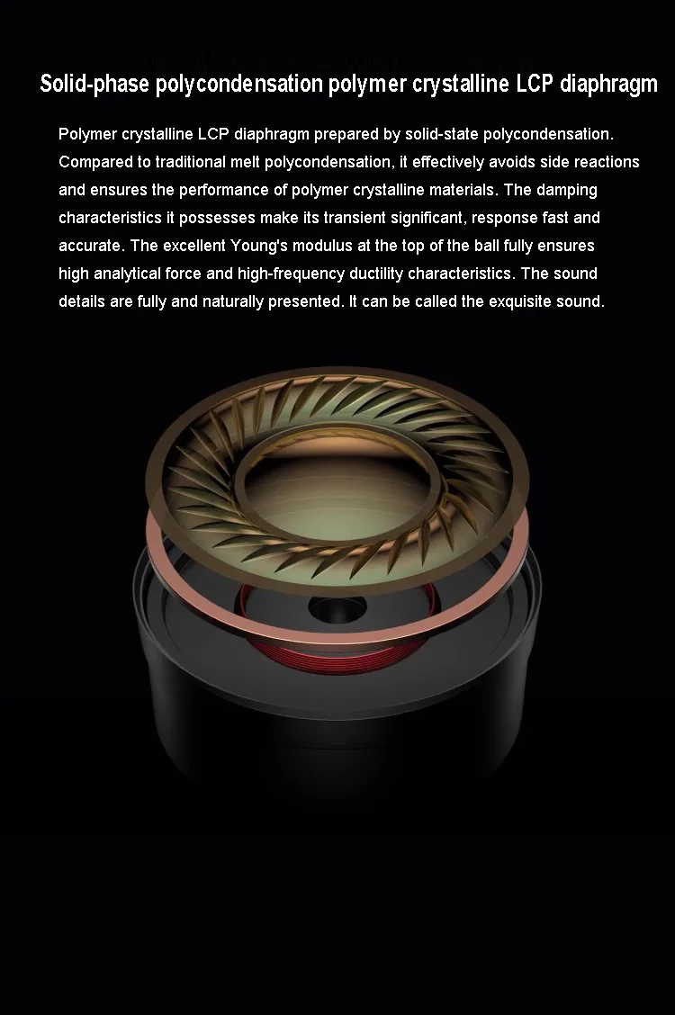 Polymer crystalline LCP diaphragm prepared by solid-state polycondensation. Compared to traditional melt polycondensation, it effectively avoids side reactions and ensures the performance of polymer crystalline materials. The damping characteristics it possesses make its transient significant, response fast and accurate. The excellent Young's modulus at the top of the ball fully ensures high analytical force and high-frequency ductility characteristics. The sound details are fully and naturally presented. It can be called the exquisite sound.