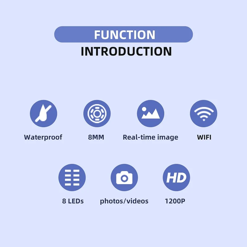 WiFi Endoscope Camera 8MM HD1200P IP67 Waterproof USB Inspection Borescope 8LEDs Wireless Endoscopy for Android Iphone PC F130