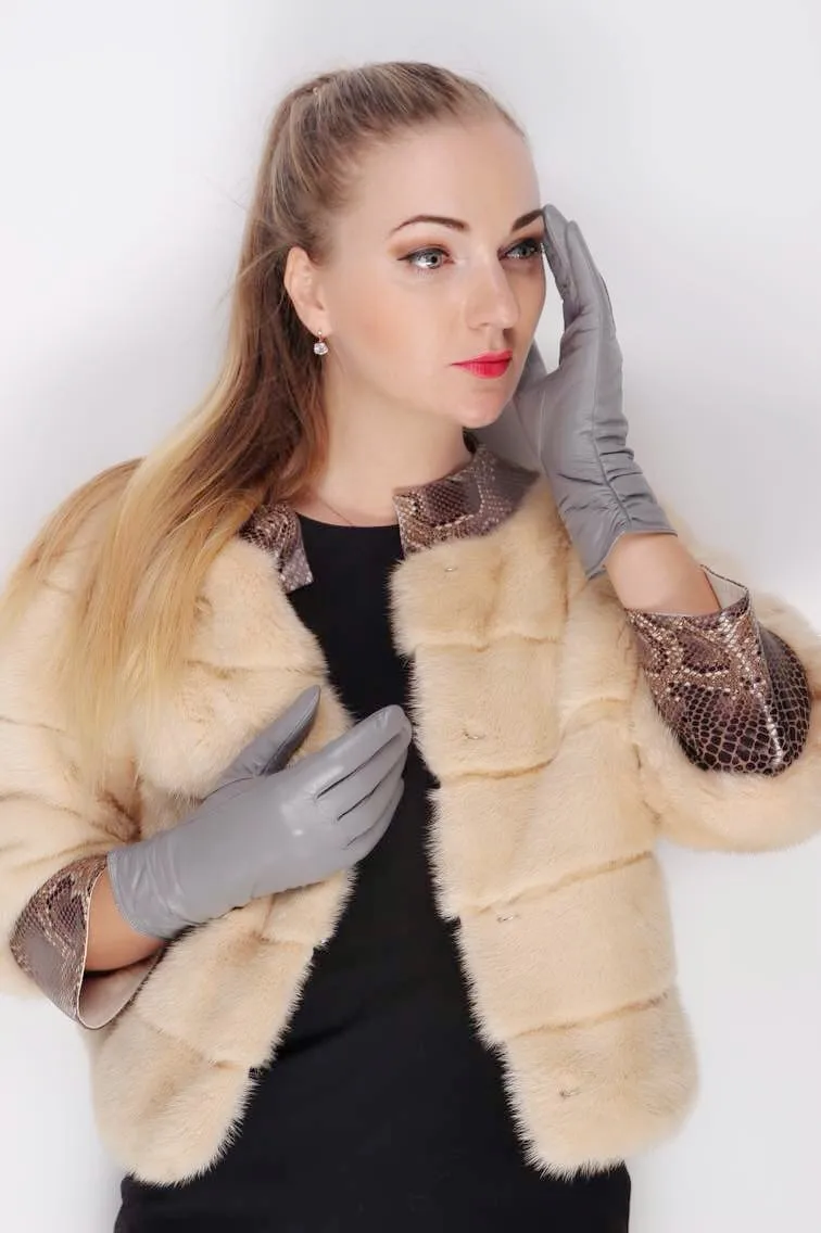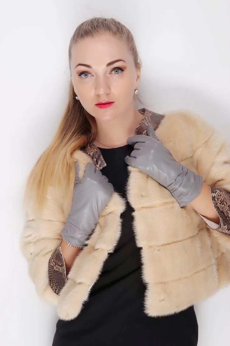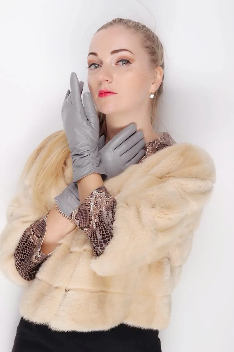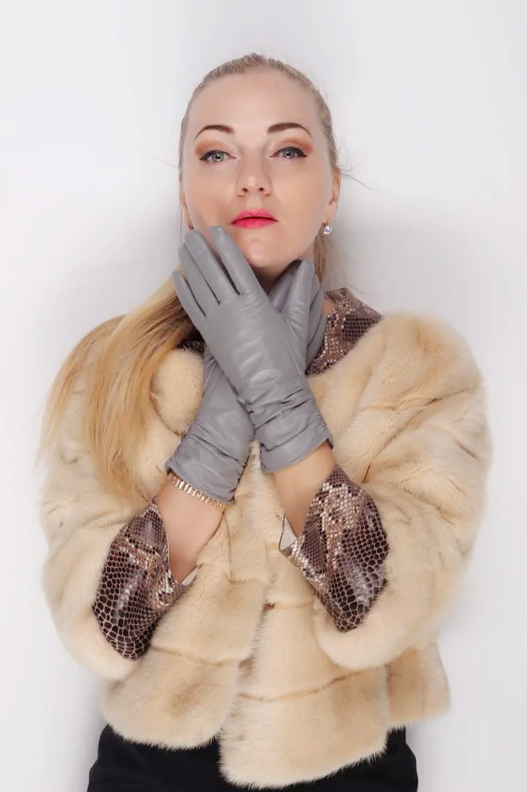 Light gray women leather gloves, sheepskin gloves female,best-selling women's winter mittens,Genuine Leather gloves women-2081