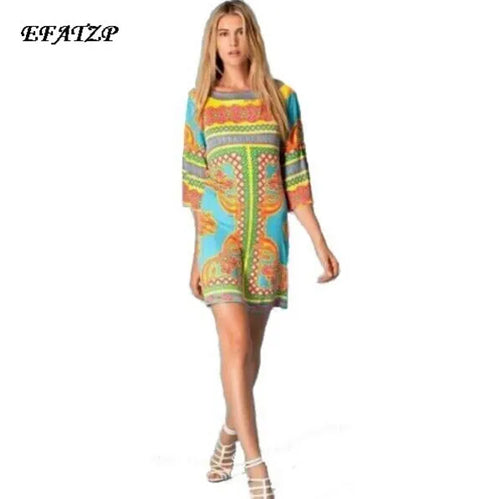 EFATZP Autumn Brand Jersey Silk Dress Women's 3/4 Sleeves Colorful Geometric Print Knee Length Dress