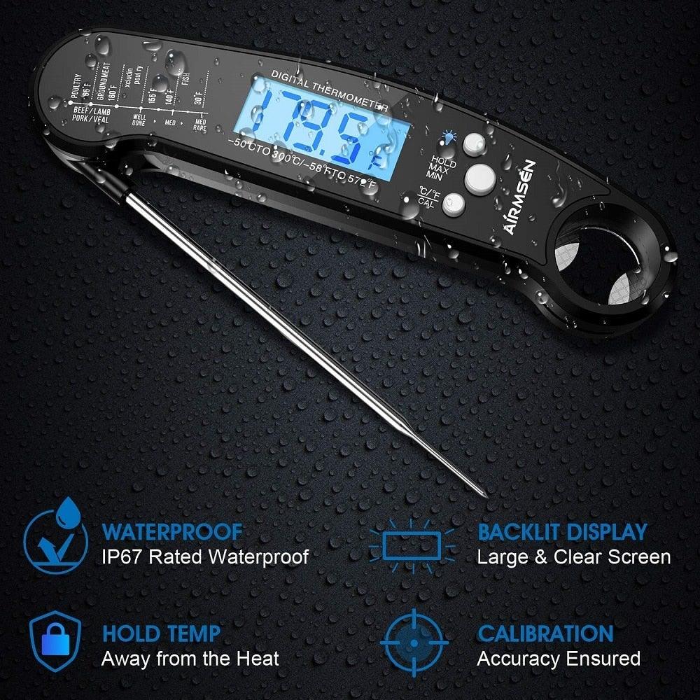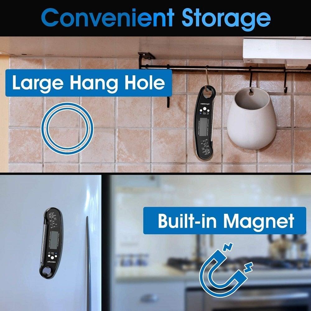 - BIG 1.75” BRIGHT LCD, CONVENIENT & EASE TO USE- Thermometer for grilling has an internal magnet makes it convenient for storage. Ultra-safe folding design & auto shut off after 10 min. Instant Thermometer case is made of strong ABS plastic