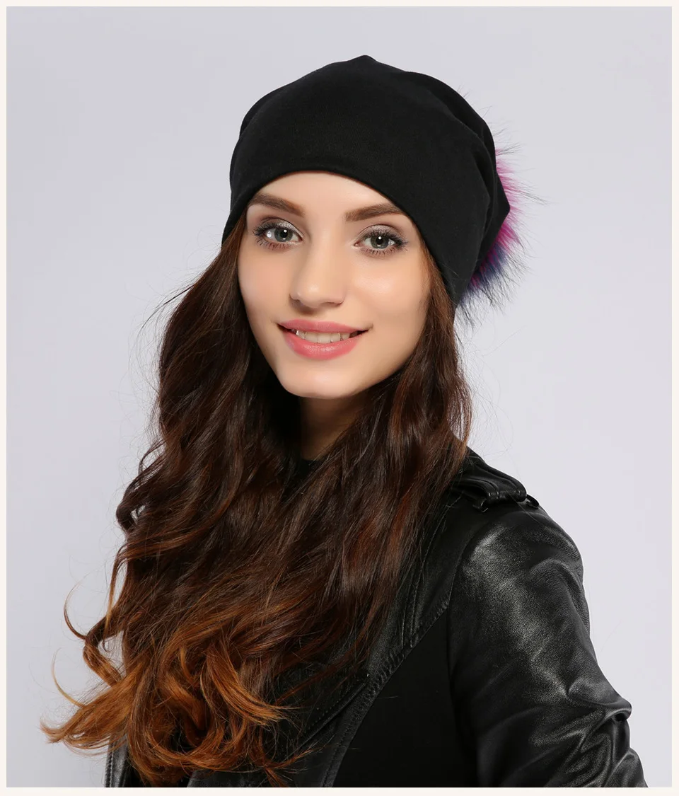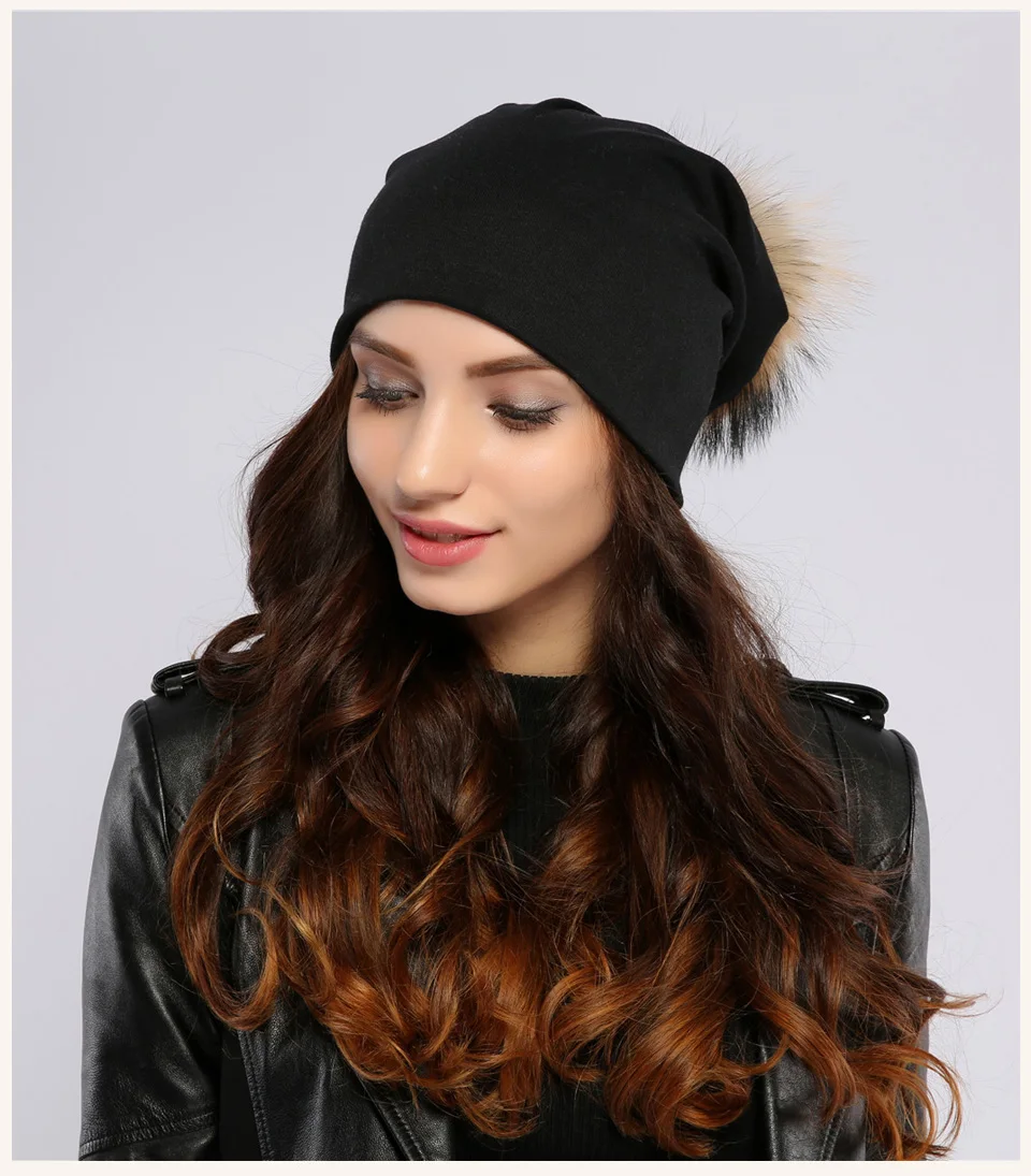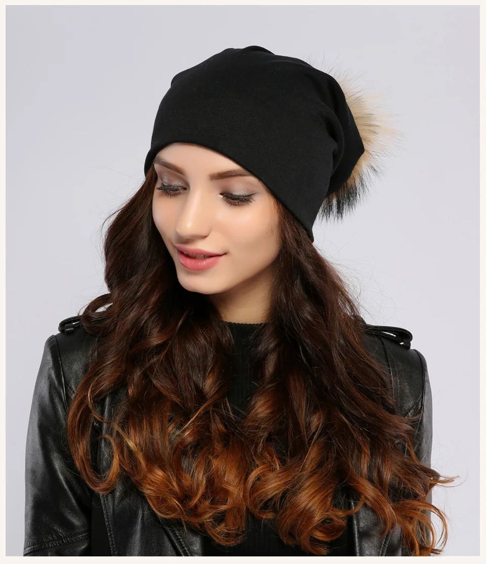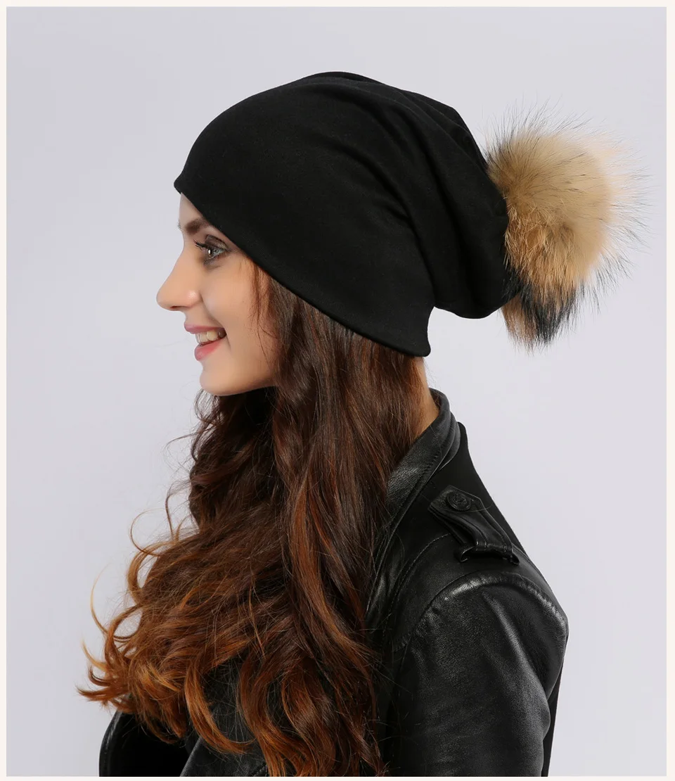 Geebro Brand Women's Beanie Hat Casual Cotton Pompom Beanies Hats Raccoon Fox Fur Pompon Skullies Balaclava Caps For Women JS294