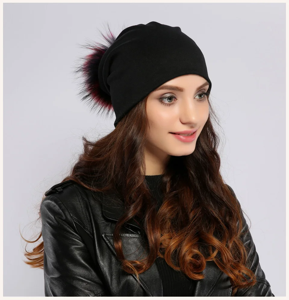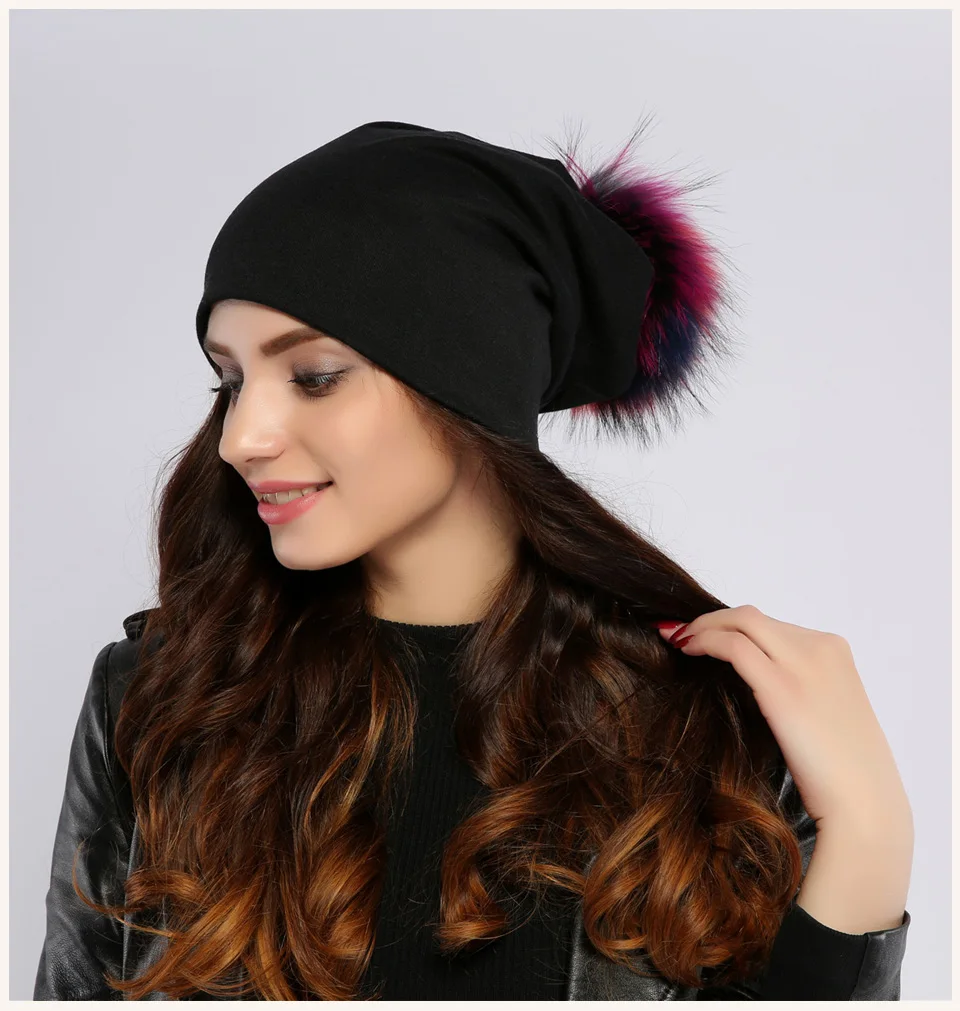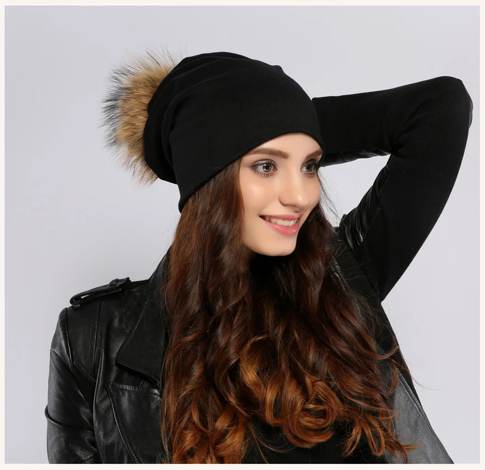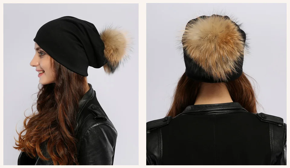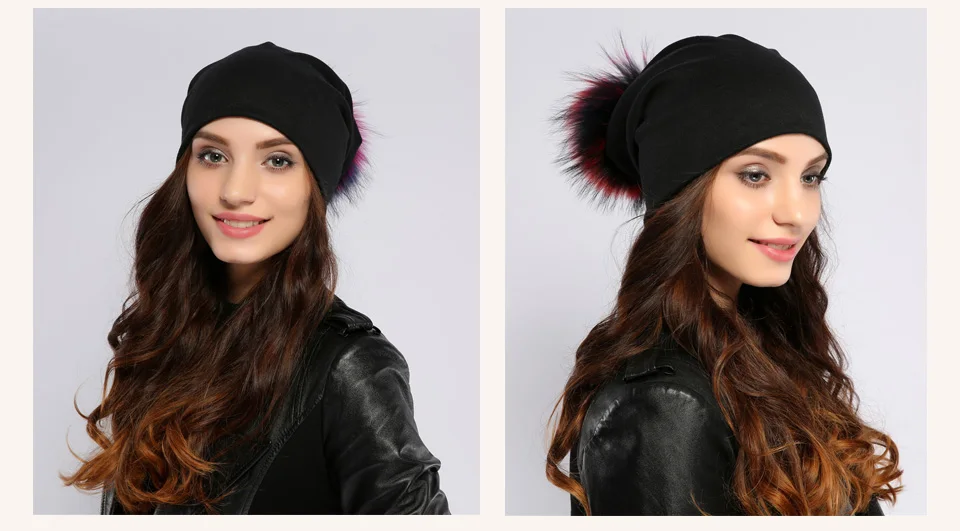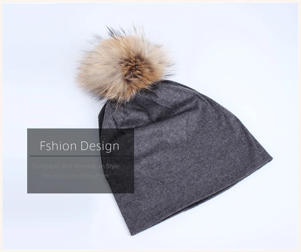 Geebro Brand Women's Beanie Hat Casual Cotton Pompom Beanies Hats Raccoon Fox Fur Pompon Skullies Balaclava Caps For Women JS294