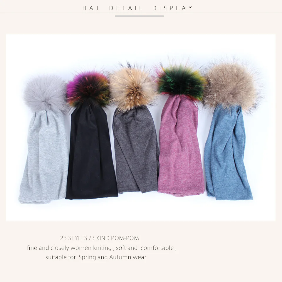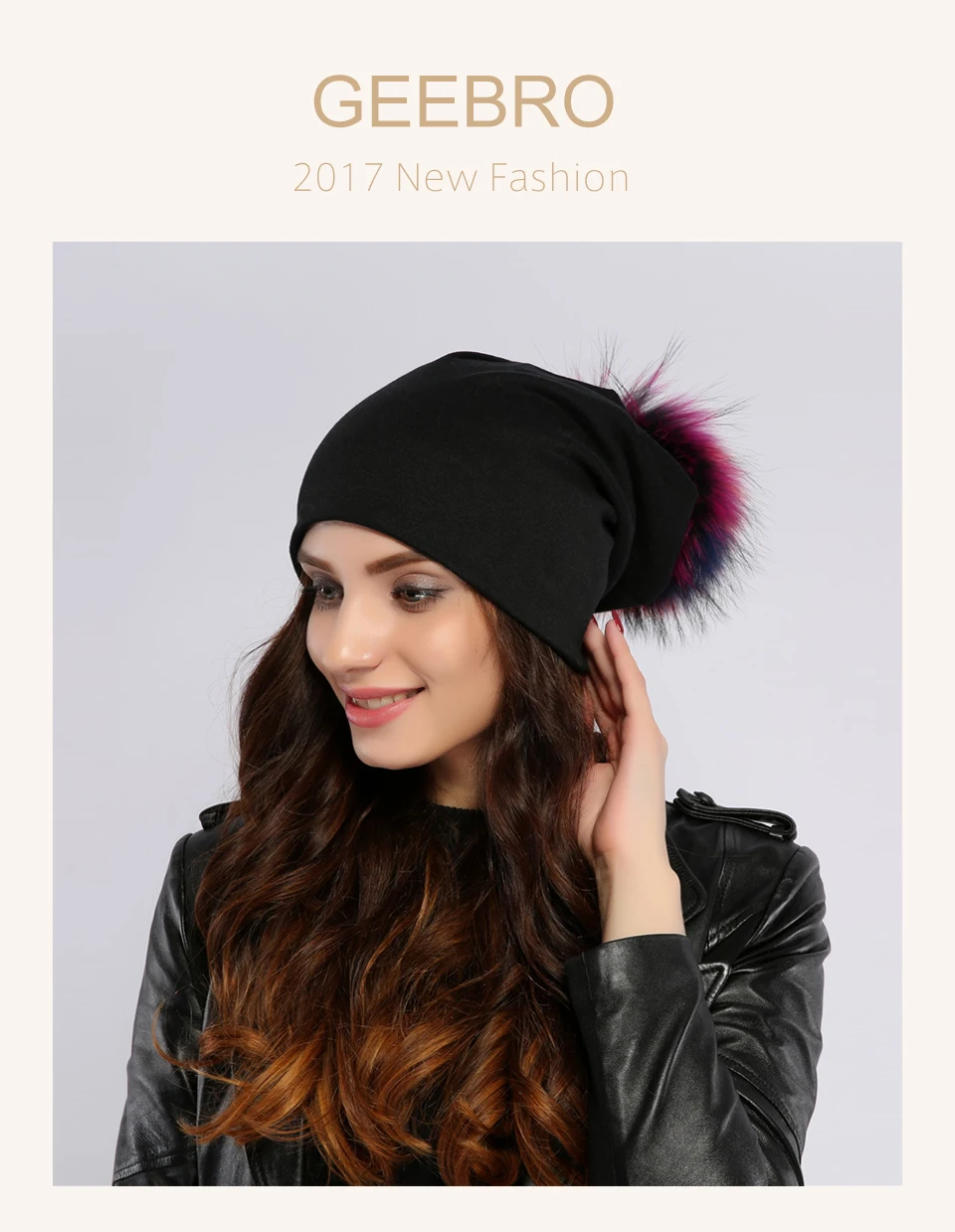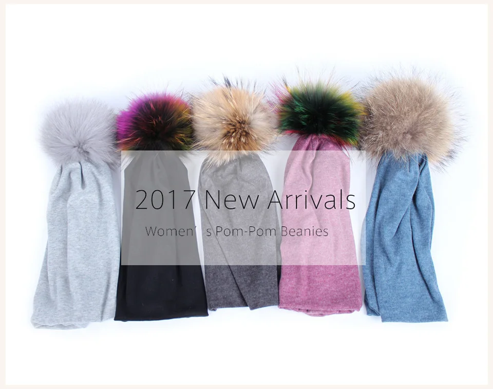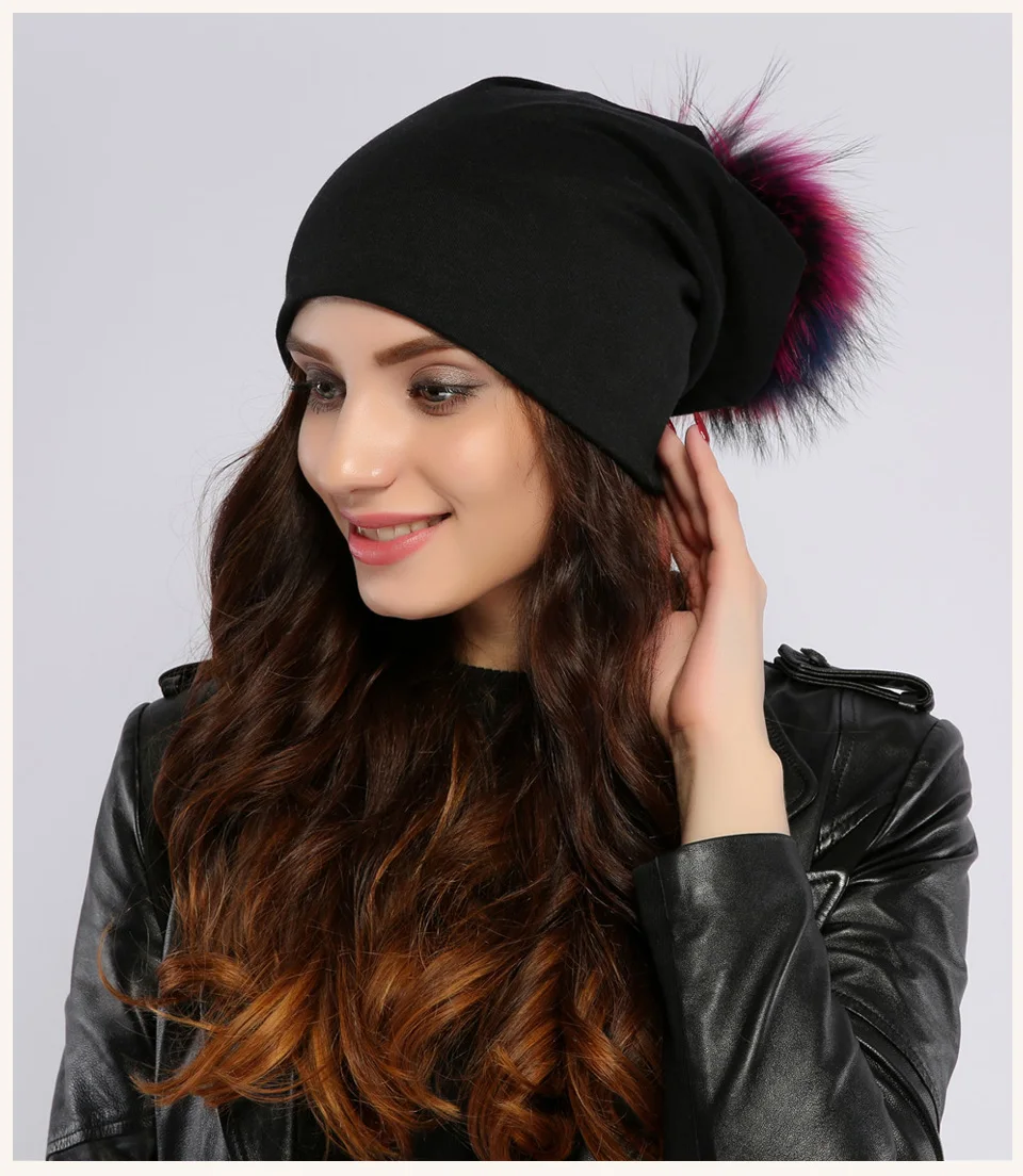 Geebro Brand Women's Beanie Hat Casual Cotton Pompom Beanies Hats Raccoon Fox Fur Pompon Skullies Balaclava Caps For Women JS294