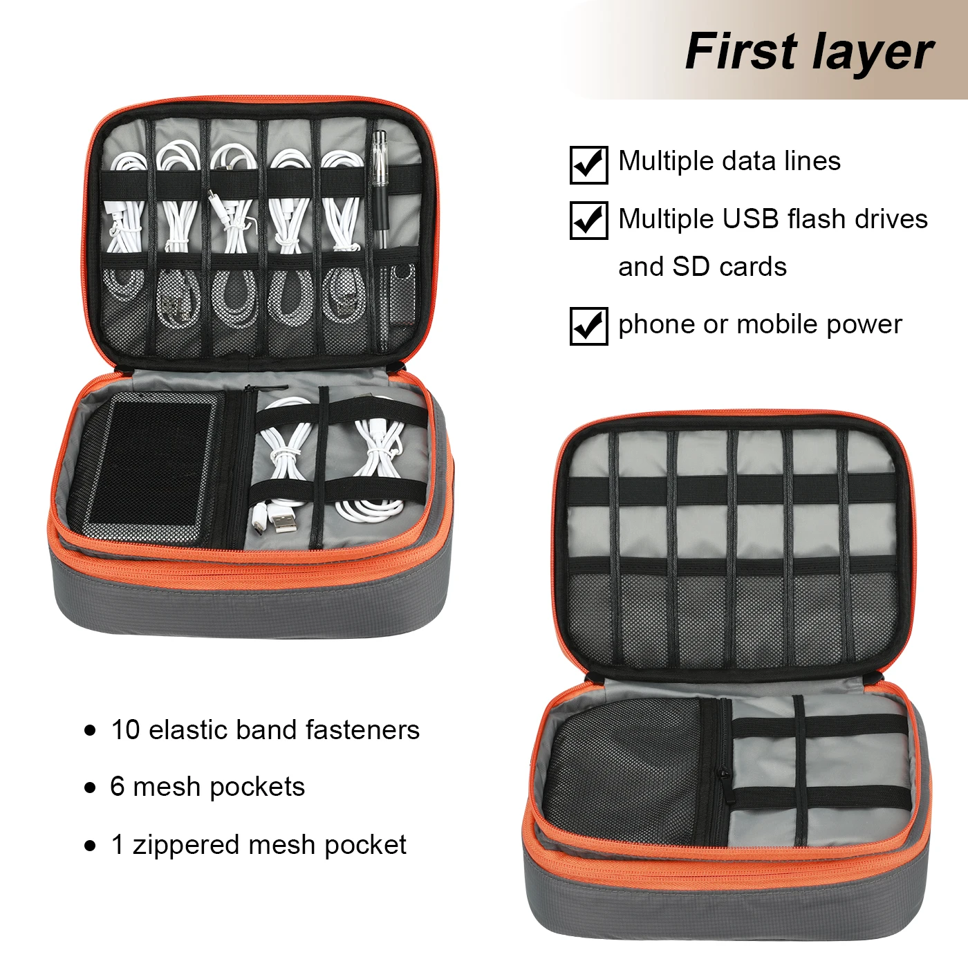 Large Capacity: The Electronics Bag has 2 main layers with 10 elastic loops for cables, 7 mini mesh segments, 2 mesh pockets, 1 11''laptop pocket, 4 loops to take in your power bank, chargers, hard drive and more room for other electronics.